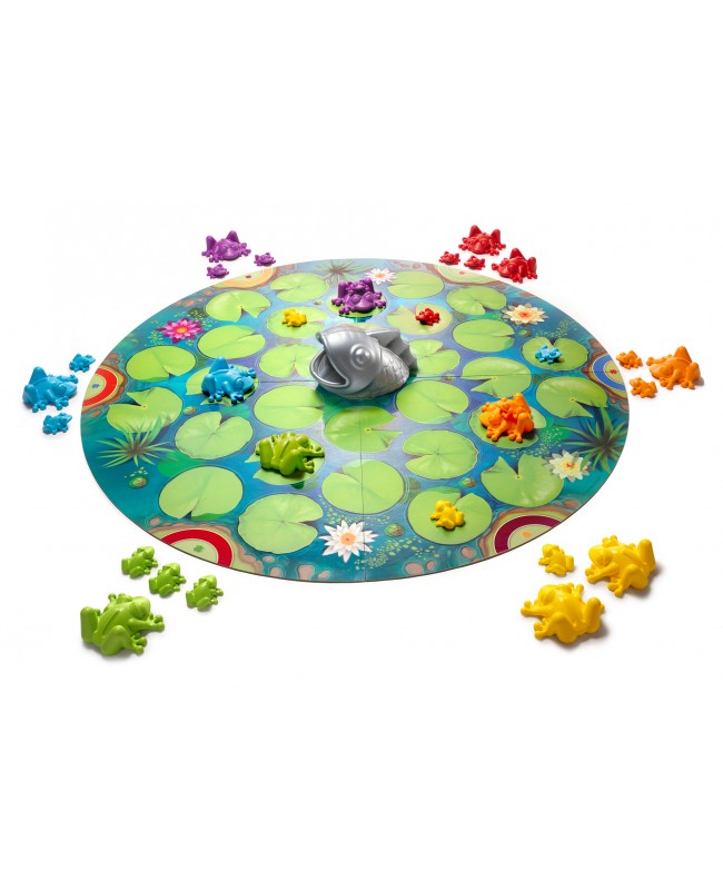 Faites traverser l’étang à vos grenouilles tout en empêchant les autres joueurs de faire de même. Le premier joueur qui réussit à amener toute sa famille de l’autre côté remporte la partie. Mais attention, le brochet peut effrayer vos grenouilles et les renvoyer à leur point de départ. Elaborez une stratégie, adaptez-là et n’hésitez pas à gêner vos adversaires!