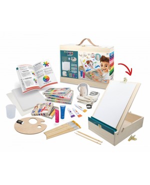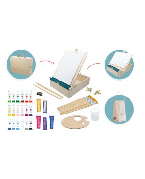 Enfile le tablier et apprends les techniques de la peinture acrylique avec cette mallette en bois qui se transforme en chevalet.