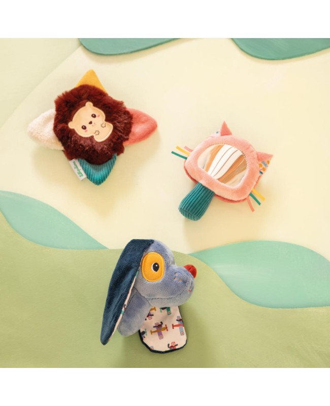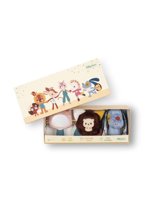 Offrez ces premiers jouets Lilliputiens à bébé ! Ce set de 3 hochets en tissu convient dès la naissance : un cadeau idéal, qui saura éveiller les sens et titiller la curiosité des petits. Présentés dans leur joli coffret illustré, ces jouets d’éveil sensoriel stimulent 3 sens : la vue, le toucher et l’ouïe. Pour cela, retrouvez : Jules le chien et ses longues oreilles, qui produit un bruissement amusant ; Jeanne le chat et ses moustaches colorées, avec son petit miroir pour s’observer ; et Léon le hérisson tout rond, qui propose plusieurs textures à découvrir du bout des doigts.