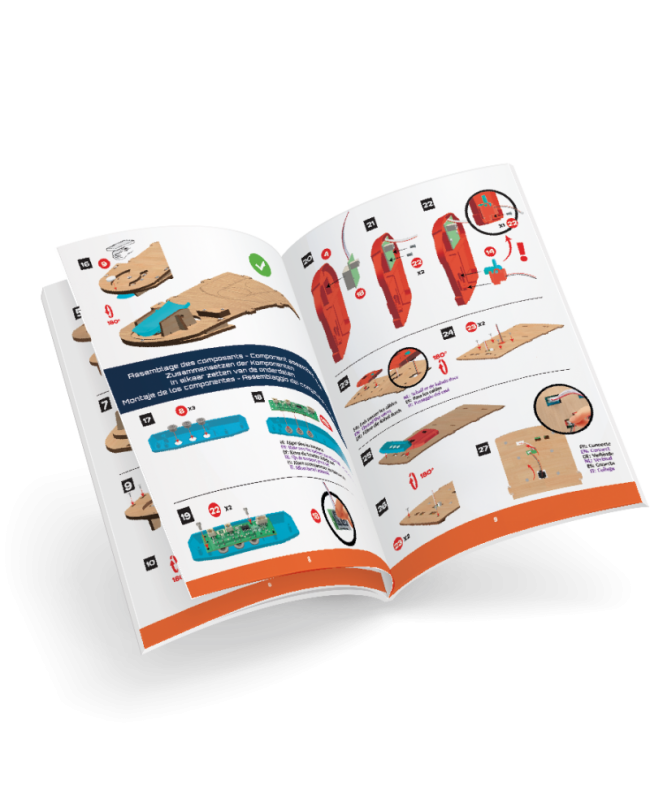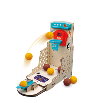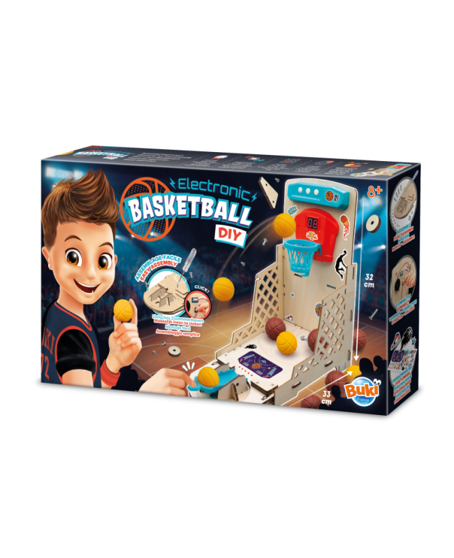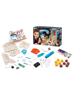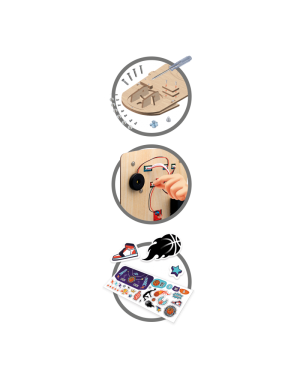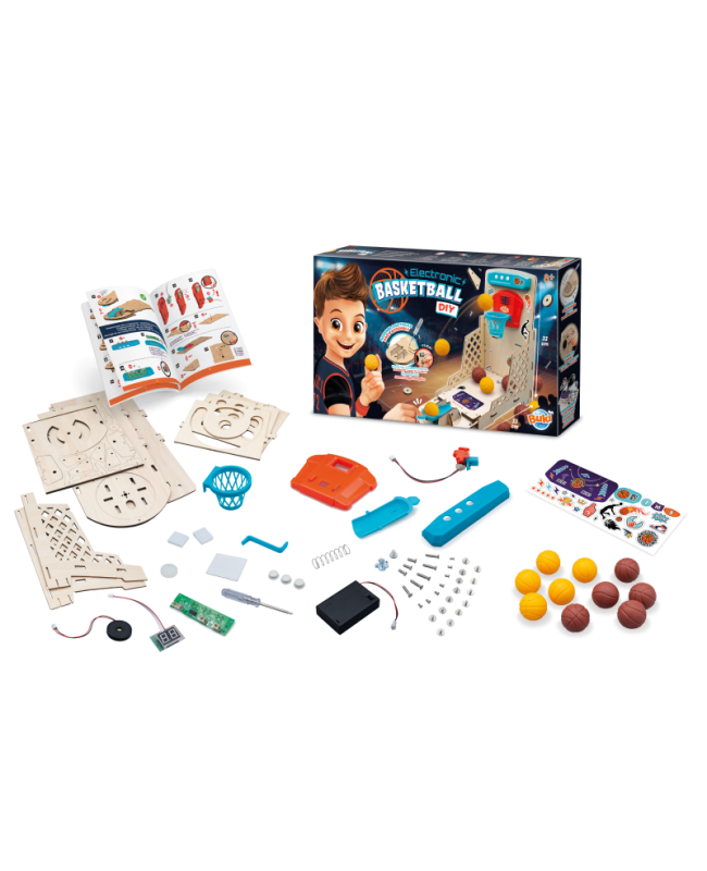 Un coffret pour monter son panier de basket électronique. Avec le tournevis inclus, l’enfant va assembler sans soudure et sans danger: le tableau des scores, le panneau de contrôle, le haut-parleur et le compartiment à piles. Personnalise le panier avec les autocollants.