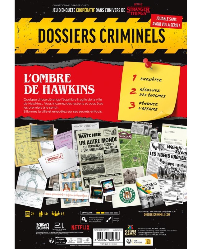 Enquêtez, résolvez des énigmes, dénouez l'affaire. Cette nouvelle enquête coopérative vous plonge dans l'atmosphère angoissante de Hawkins, la petite ville américaine où se déroule l'intrigue de la série Netflix Stranger Things. Marchez dans les pas de Mike, Lucas, Steve et Dustin, pour résoudre le mystère auquel vous êtes confrontés. Serez-vous obligés de vous rendre dans la dimension parrallèle du terrifiant "Monde à l'envers" ? Vous pouvez y jouer sans avoir vu la série : ce dossier criminel contient tous les éléments pour résoudre l'affaire. Un accès à internet est nécessaire afin de débloquer plusieurs bases de données. Plusieurs niveaux d’indices sont disponibles sur le site afin que vous ne restiez pas bloqué dans cette enquête de difficulté 2 sur 5.