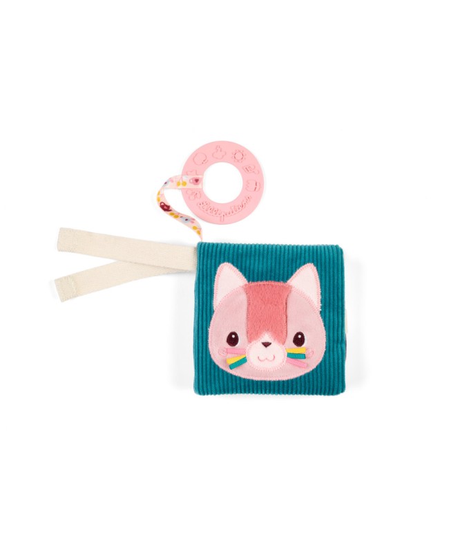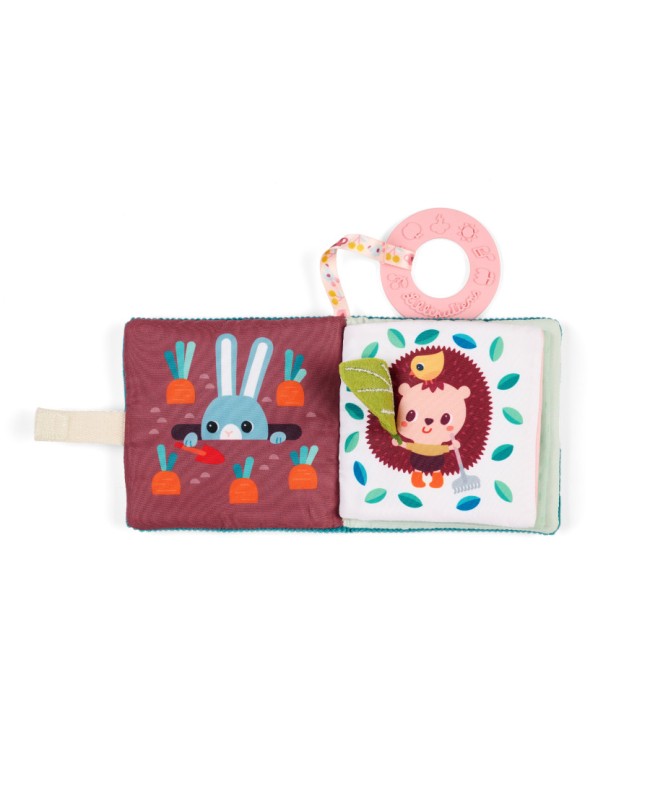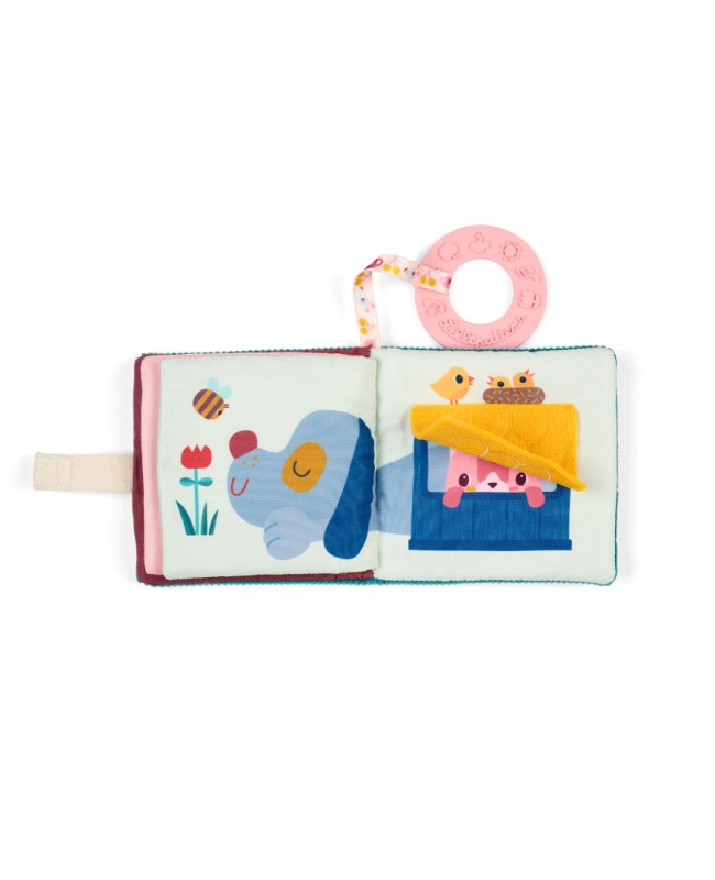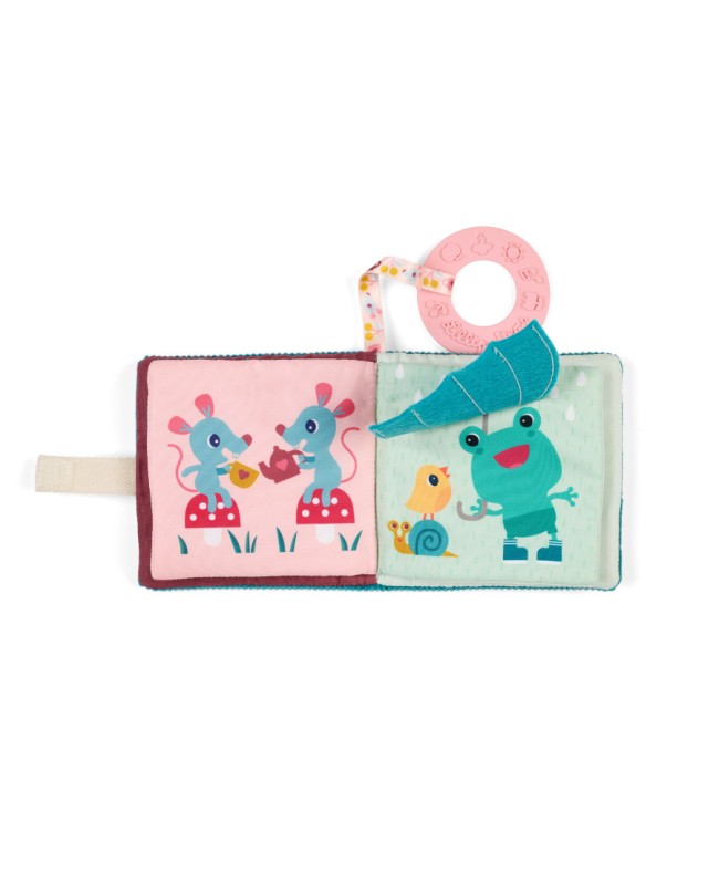 Bébé développe ainsi son acuité visuelle et sa motricité fine ! Jeanne rencontre ses amis du jardin : les souris malicieuses autour d'un thé, Jules le chien qui fait sa sieste, un lapin gourmand et James la grenouille qui a sorti son beau parapluie ! Les illustrations colorées stimulent la vue, tandis que les matières variées éveillent le sens du toucher. Bébé développe sa motricité fine et son vocabulaire en découvrant le nom des animaux au fil de l'histoire. Et pour attiser sa curiosité et favoriser l’éveil auditif, la couverture contient du papier bruissant à faire crépiter : un plaisir pour les petites mains ! Le petit plus ? Un anneau de dentition rose avec des motifs en relief, idéal pour soulager les gencives lors des poussées dentaires. Bébé peut feuilleter son imagier ou mordiller l’anneau en toute sécurité. Et grâce au ruban avec attache scratch, vous pouvez l’accrocher partout pour l’avoir toujours à portée de main. Ce livre d'images en tissu peut être lavé en surface.