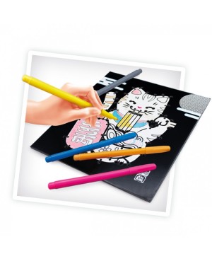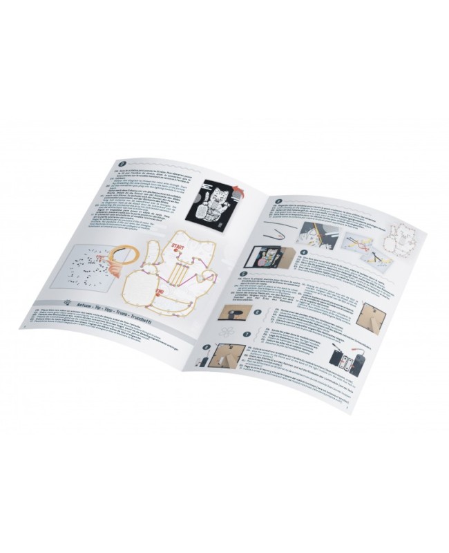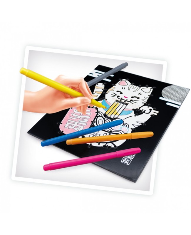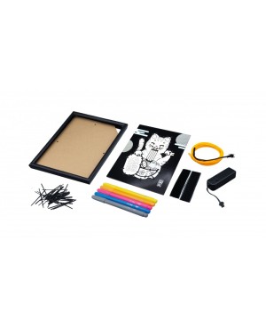 Colorie avec les feutres, passe le fil néon en suivant le schéma et place le tableau dans le cadre.