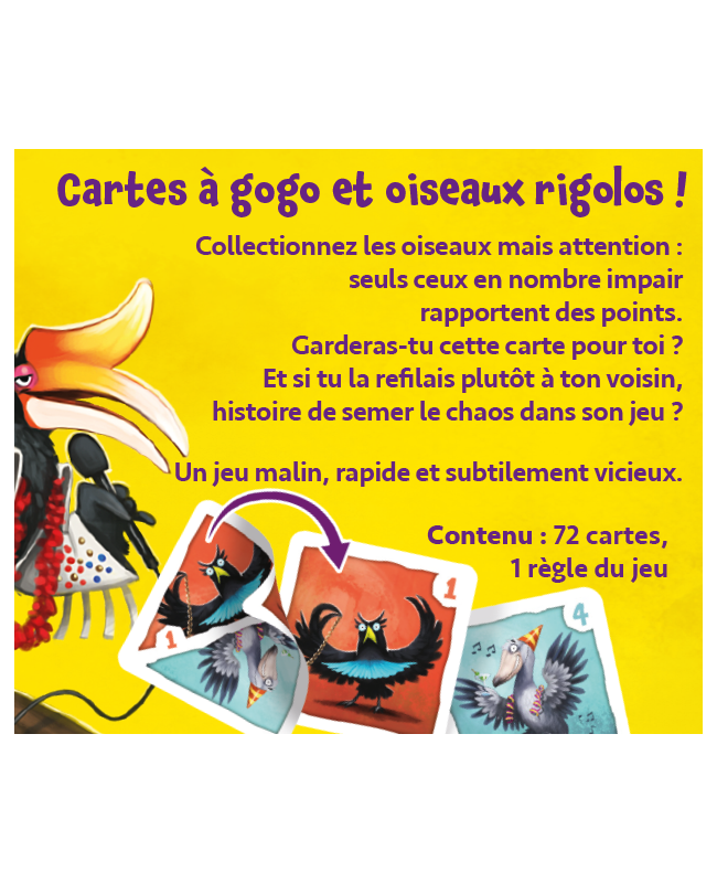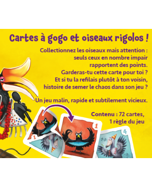 Marquez le plus de points en collectant le plus de "drôles d'oiseaux" possible. Toutefois, le système de points est aussi insolite que les oiseaux eux-mêmes : chaque oiseau ne rapporte des points que s'il se trouve en un nombre impair devant vous à la fin de la partie !