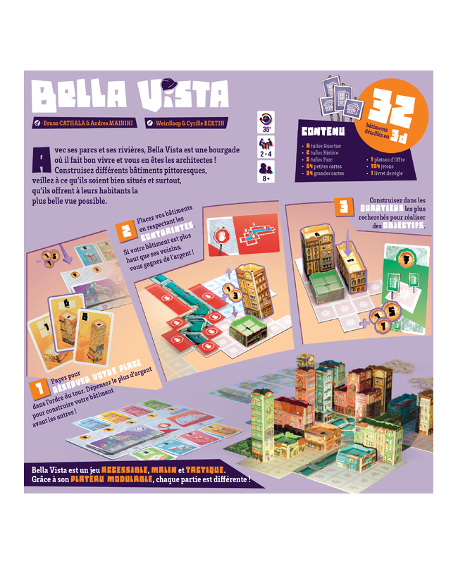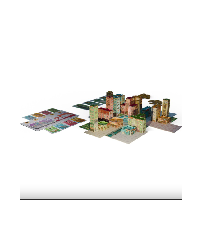Pour l’emporter, choisissez avec soin l’emplacement où ériger vos bâtiments afin de remplir les contrats les plus avantageux, tout en respectant les contraintes imposées par la mairie. La concurrence est rude : choisissez stratégiquement votre place dans l’ordre de construction et soyez prêt à payer le prix fort pour les meilleurs emplacements. Une fois vos huit bâtiments construits, la partie prend fin. Si vous êtes le plus riche, vous remportez la partie !