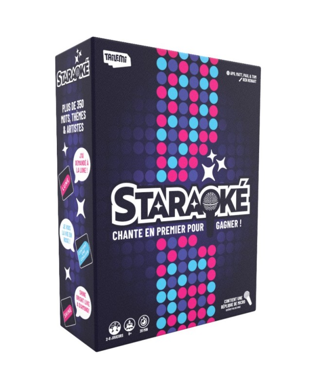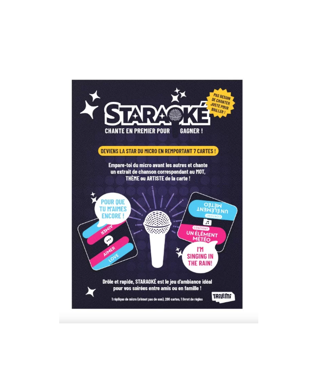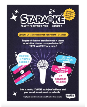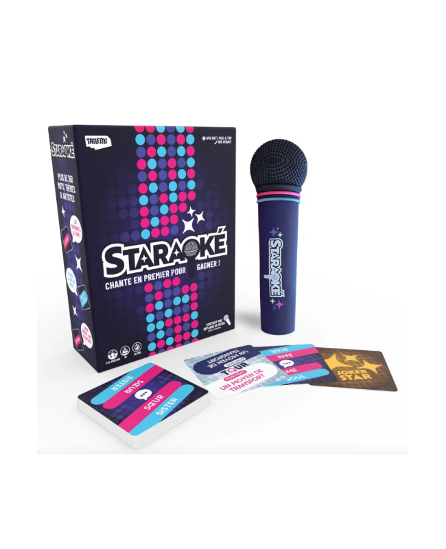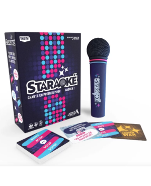 Staraoké est un jeu musical de rapiditéoù les joueurs doivent chanter un extrait de chanson contenant le mot, le thème ou artistes indiqués sur la carte catégorie. Le premier qui attrape le micro et chante un extrait correspondant à la carte catégorie remporte le tour. Des cartes spéciales STAR TOUR contiennent également un mot ou artistes mais déclenchent une « mort subite ». A tour de rôle les joueurs doivent chanter une chanson respectant la catégorie de la carte. Le dernier en lice remporte le tour.