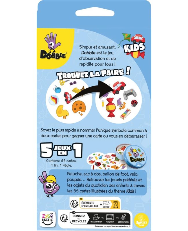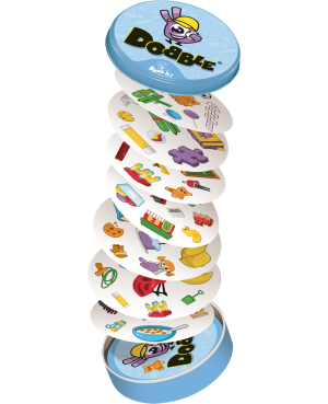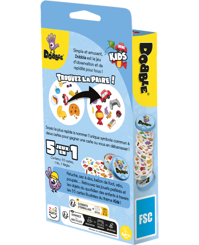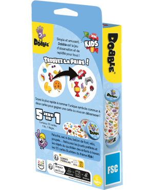 1 boîte, 5 jeux : c’est aussi le Dobble pour les plus petits ! Repérez vite l’unique symbole en commun entre les cartes et, selon la règle du jeu en cours, remportez la partie ! Grâce à des règles claires, assimilées en l’espace d’une minute, Dobble, c’est l’assurance d’une ambiance folle autour de la table !