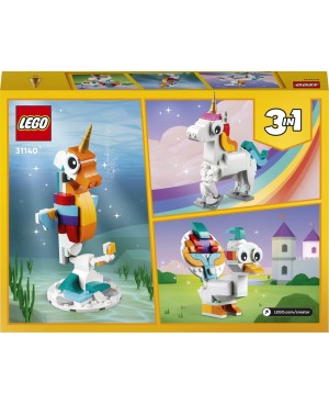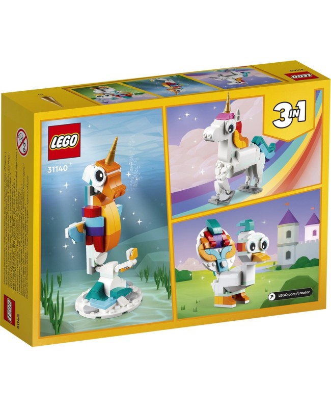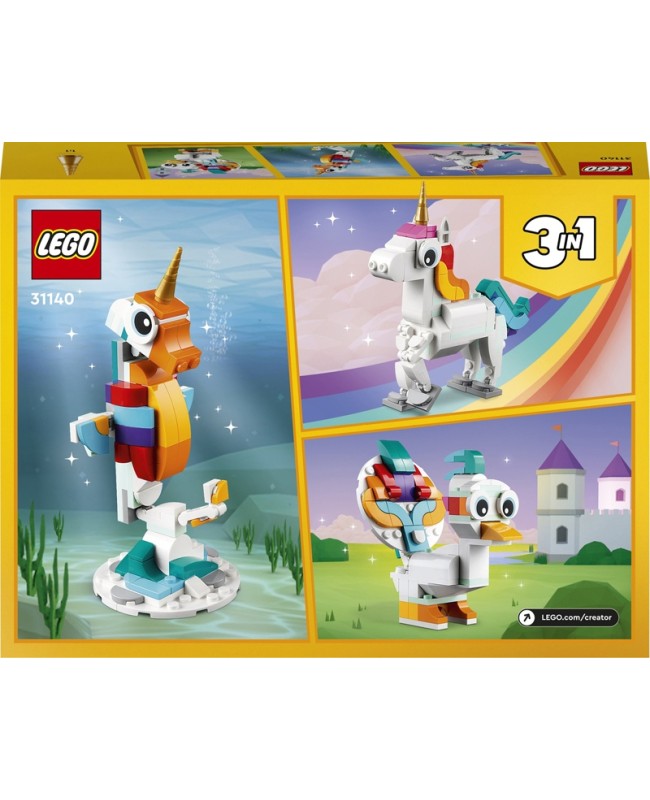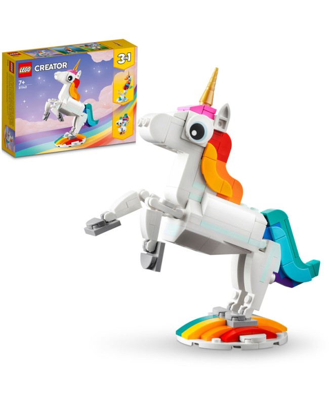 Les enfants imaginatifs dès 7 ans peuvent partir à l'aventure dans une contrée mythique avec le set LEGO® Creator 3-en-1. La licorne magique (31140). Il inclut une licorne avec une corne dorée, une queue colorée ainsi que des pattes et des sabots mobiles. La licorne peut être exposée sur ses 4 pattes ou cabrée sur ses pattes arrière sur le support arc-en-ciel. Construire des animaux colorés avec les briques LEGO®L'action ne s'arrête jamais avec les 3 créatures magiques articulées de ce set LEGO Creator 3-en-1.