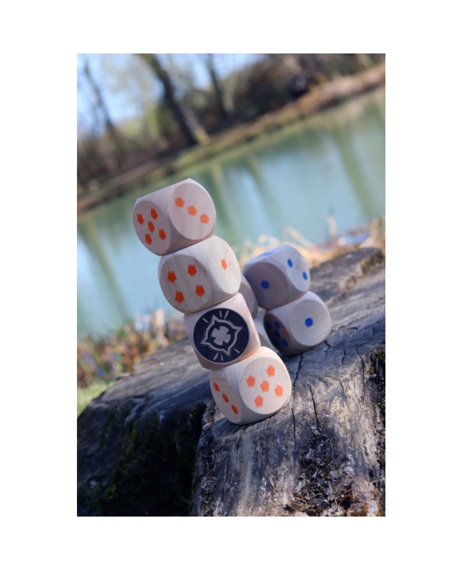 Le jeu se compose de deux dés Maro, qui serviront de cible… et de multiplicateur de score. A la fin de chaque manche, en effet, le dé le plus proche de chaque dé Maro marquera son nombre de points multiplié par la valeur du dé Maro. Chaque équipe dispose également de deux dés de sa couleur.