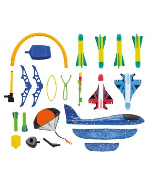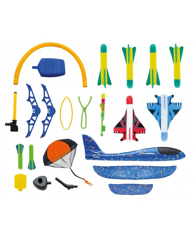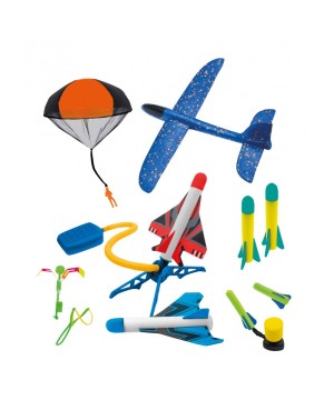 Inclus : 4 fusées, 2 avions à réaction, 1 planeur, 1 lance-hélicopter, 1 parachute, 2 mini-fusées, 1 base de lancement et 1 notice illustrée.