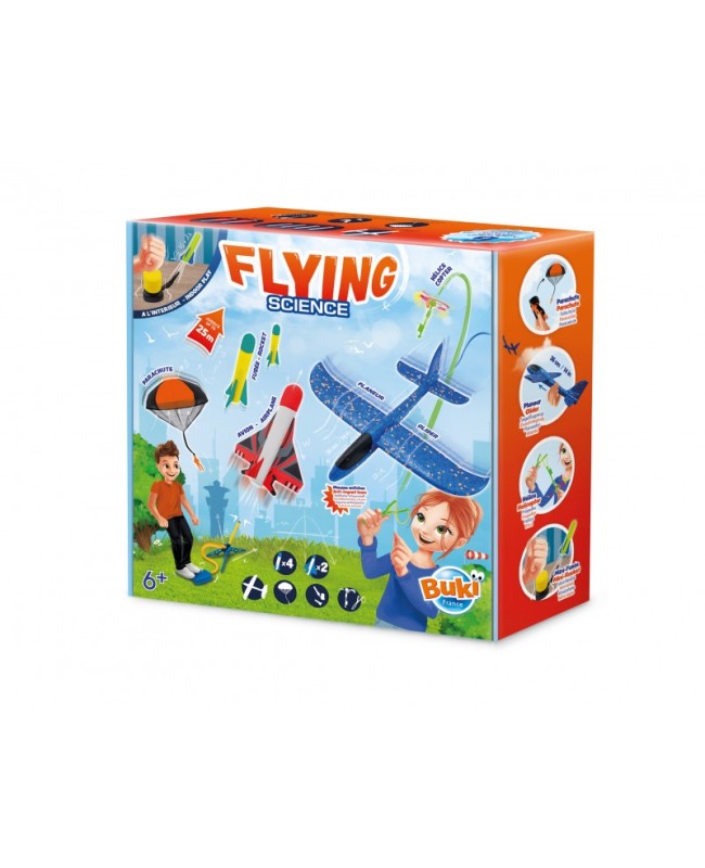 Découvre 6 jouets volants à tester à l’extérieur ou à l’intérieur : 4 fusées, 2 avions, 1 planeur, 1 lance-hélicoptère, 1 parachute et 2 mini-fusées.