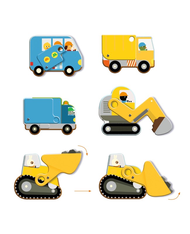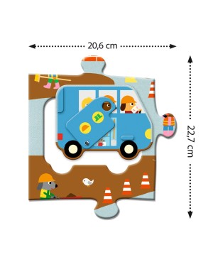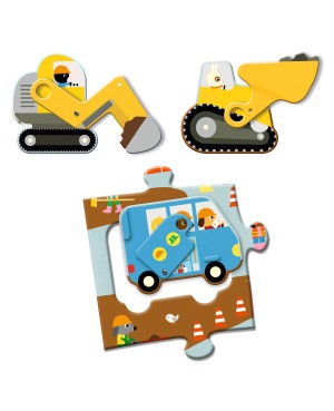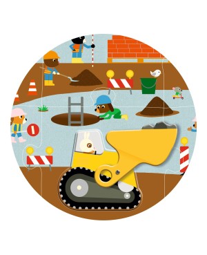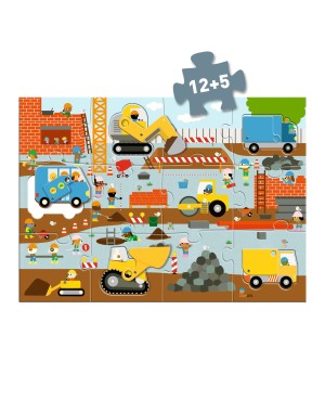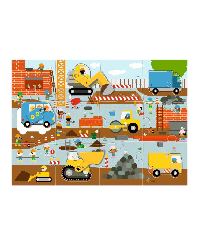 Avec ses 12 pièces géantes, ce puzzle prend vie grâce à ses pièces articulées. L’enfant assemble chaque morceau pour reconstituer un chantier dynamique, où il pourra placer la pelleteuse, le bus et le camion à leur emplacement. Une activité captivante qui combine réflexion, manipulation et imagination !