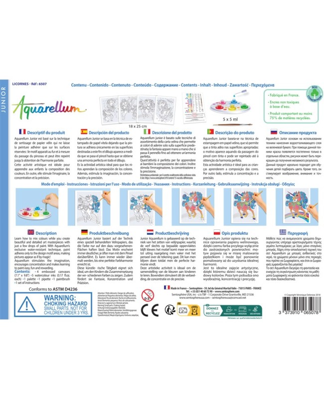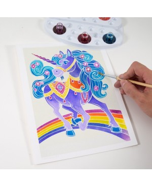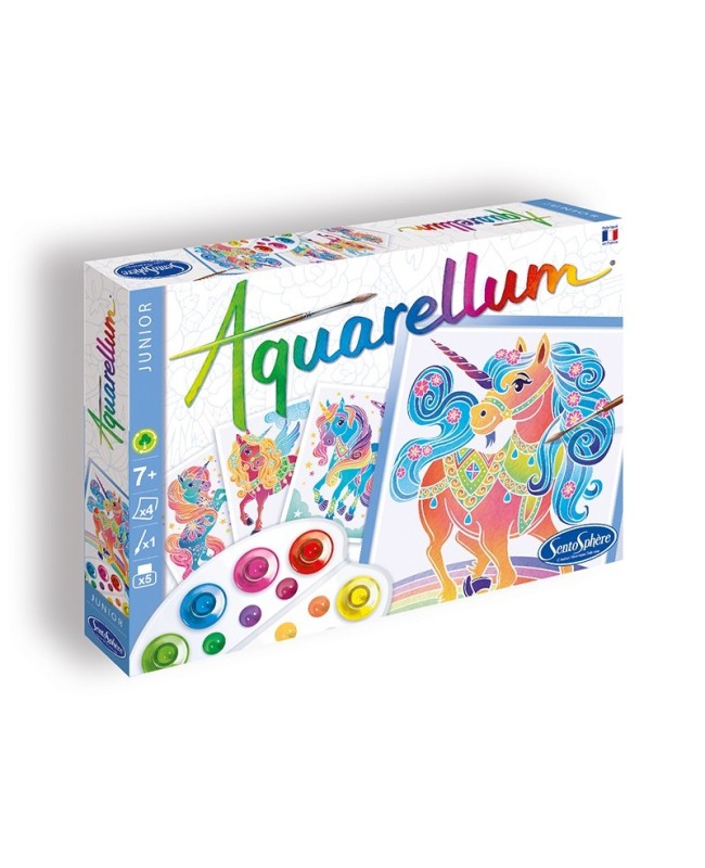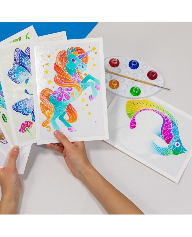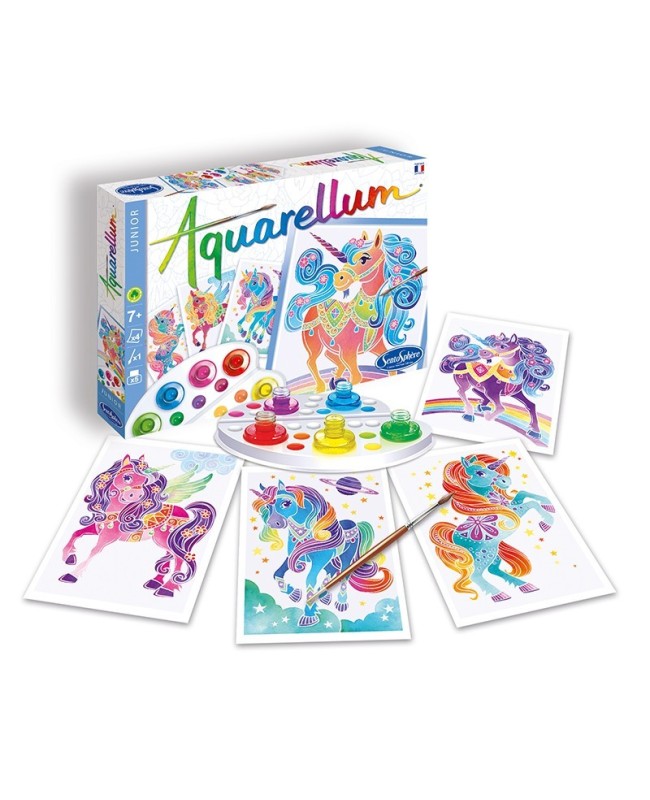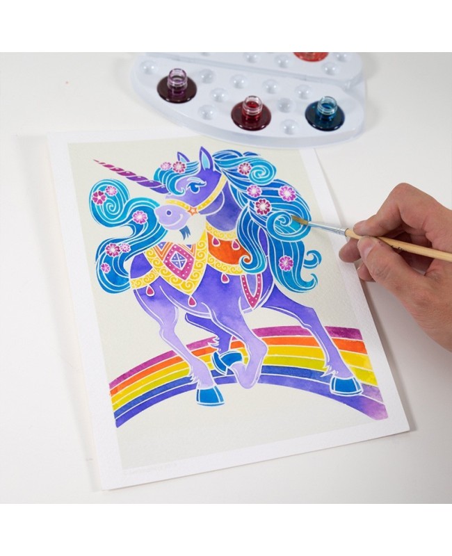Grâce à notre coffret magique d'aquarelles lavables et non toxiques, rehaussez de couleurs, ces quatre licornes fantastiques !