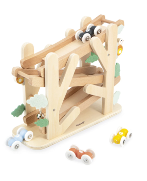 On craque pour le bois naturel de cette rampe pour voitures, les petites bêtes du jardin qui la décorent et les feuillages en feutrine qui apporte une touche sensorielle intéressante. Les fourmis roulantes sont numérotées, comme de vrais bolides, et sont faciles à manipuler. Le tintement de la clochette sur la ligne d’arrivée ajoute une dimension sonore à ce joli descendeur pour bébé. Issu de notre collection Sweet Cocoon, il est composé de bois issu de forêts gérées durablement, certifié FSC™. Alors, qui de la fourmi noire, jaune, bleue ou marron sera la plus rapide ?