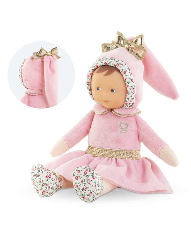 Le doudou Miss Ballerine Rose Grenadine a la peau blanche et les yeux bleus peints. La Miss est habillée d'un joli tutu en tulle rose. Sa toile de corps est en velour rose avec autour de son cou un col claudine. Elle porte un bonnet en velours rose tout doux avec un joli noeud doré. De jolis détails dorés visibles sur ses ballerines ainsi qu'une jolie broderie du coeur Corolle viennent sublimer cette Miss. Ses ballerines sont dans un tissu à motif fleuri.