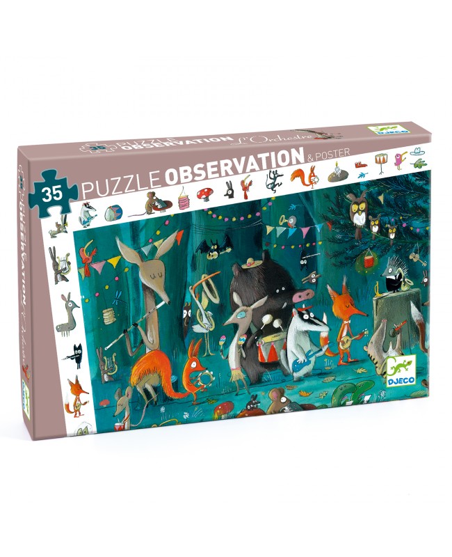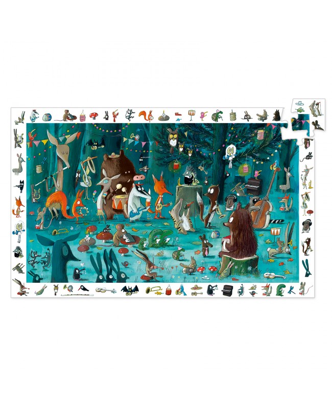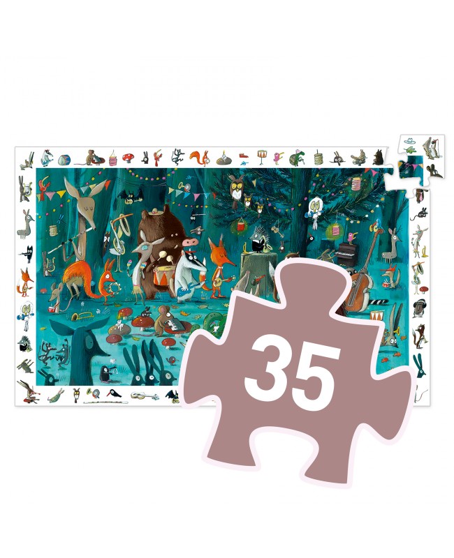 Un puzzle observation de 35 pièces représentant une forêt dans laquelle les animaux jouent de la musique. Qui joue de la guitare ? Qui joue du tambour ? L'enfant crée son puzzle puis s'amuse à retrouver dans l'image les éléments de la frise.