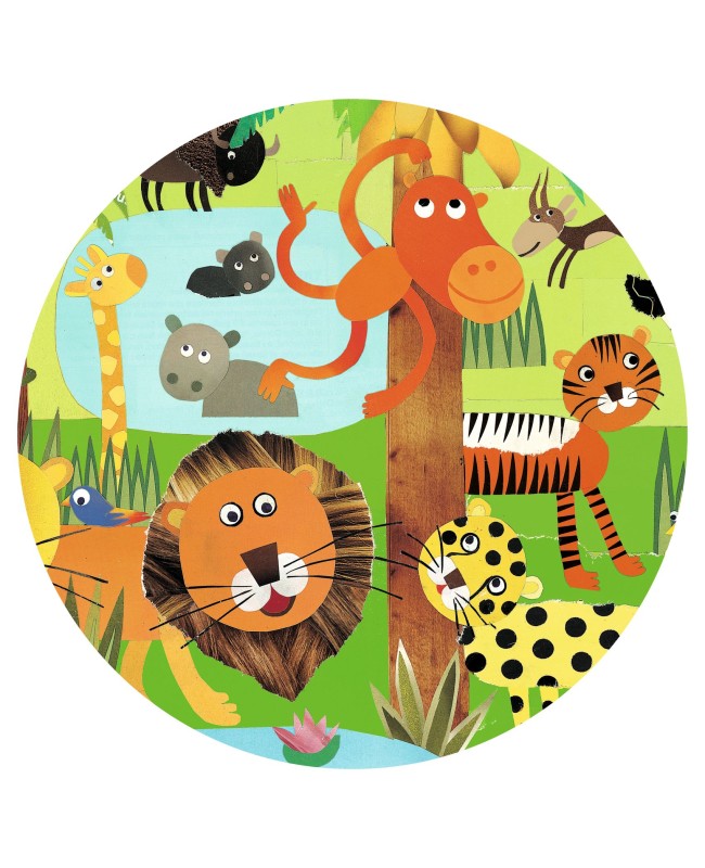 Un puzzle observation de 35 pièces pour découvrir les différents animaux dans la jungle. Que fait le singe ? Où est le crocodile ? L'enfant crée son puzzle puis s'amuse à retrouver dans l'image les éléments de la frise.